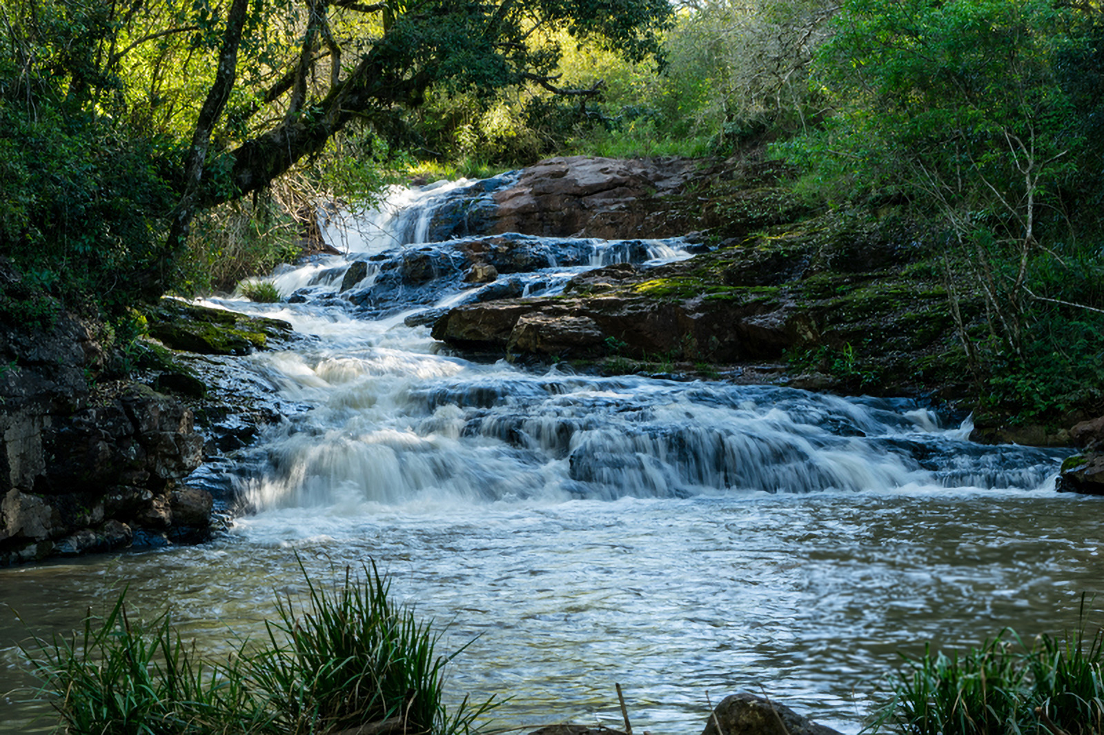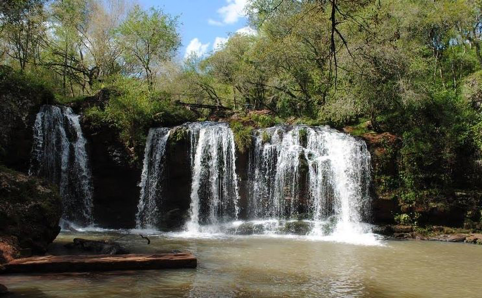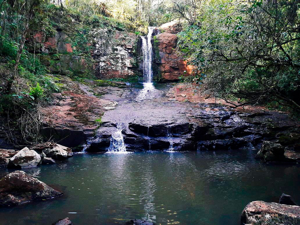 Pequeñas cascadas sobre arroyo en zona de colonia. El acceso se encuentra por ruta 14 a 8 kilómetros al norte, en dirección a Oberá, luego se entra por tierra recorriendo plantaciones de té y yerba mate.
